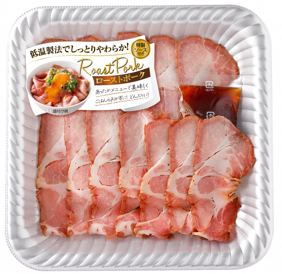 特定加熱食肉製品のローストポークです。低温でじっくり加熱することで、しっとりやわらかな食感に仕上げました。特製ソースをかけてお召し上がりください。