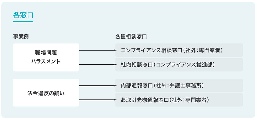風通しの良い職場環境の実現および不正防止に対する自浄作用の向上を図るため、すべての役職員がいつでも気軽に利用できる「コンプライアンス相談窓口(通報窓口を含む)」を下記のとおり設置し、問題の早期発見、早期是正に努めています。また、お取引先様から通報・相談を受け付ける専用窓口も設置することで制度の拡充を図っています。